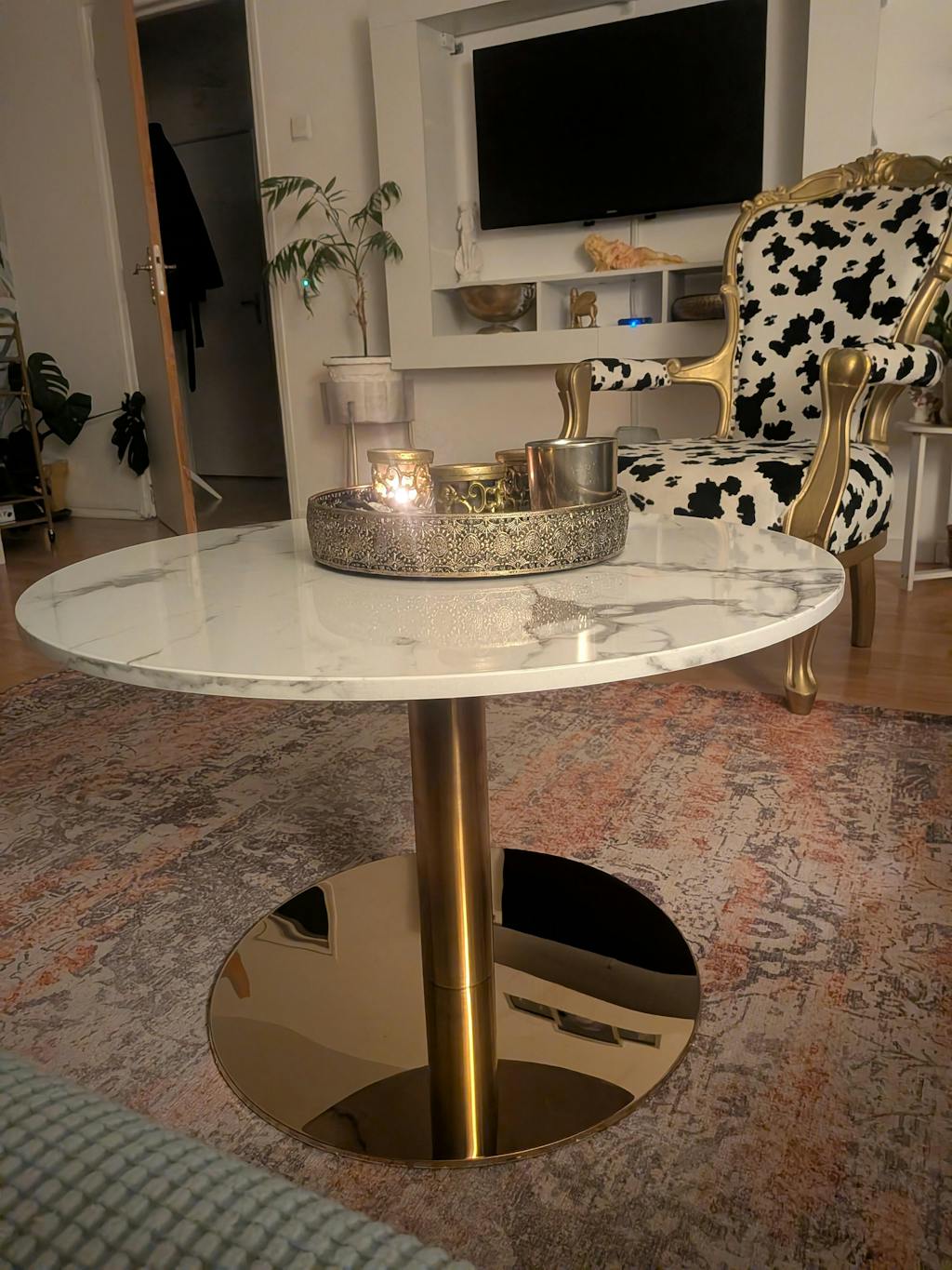 Pöytälevy itsessään on valmistettu valkoista marmoria jäljittelevästä pinnasta, joka antaa sille hienostuneen ilmeen. Valkoinen värisävy luo huoneeseen valon ja avaruuden tunteen ja sopii hyvin yhteen erilaisten sisustusaiheiden kanssa. Samalla se ei ole aitoa marmoria, joten sitä on helpompi huoltaa ilman huolta tahroista tai vaurioista. Tämän sohvapöydän käytännöllisenä etuna on lisäksi se, että se on helposti siirrettävissä, joten se voi mukautua muuttuvaan sisustustyyliisiPöydän jalat on valmistettu tukevasta metallista, ja ne on päällystetty kullattuun kultaan. Jalkojen ohut ja moderni muoto takaa vakauden ja lujuuden luoden samalla kevyen ja leijuvan ulkonäönValkoisen marmorin näköinen Lazio-sohvapöytä, jossa on kultaiset jalat, sopii erinomaisesti olohuoneen sisustuksen keskeiseksi osaksi. Se tarjoaa vaikuttavan visuaalisen keskipisteen koristeillesi, kirjoillesi tai kahvikupillesi.