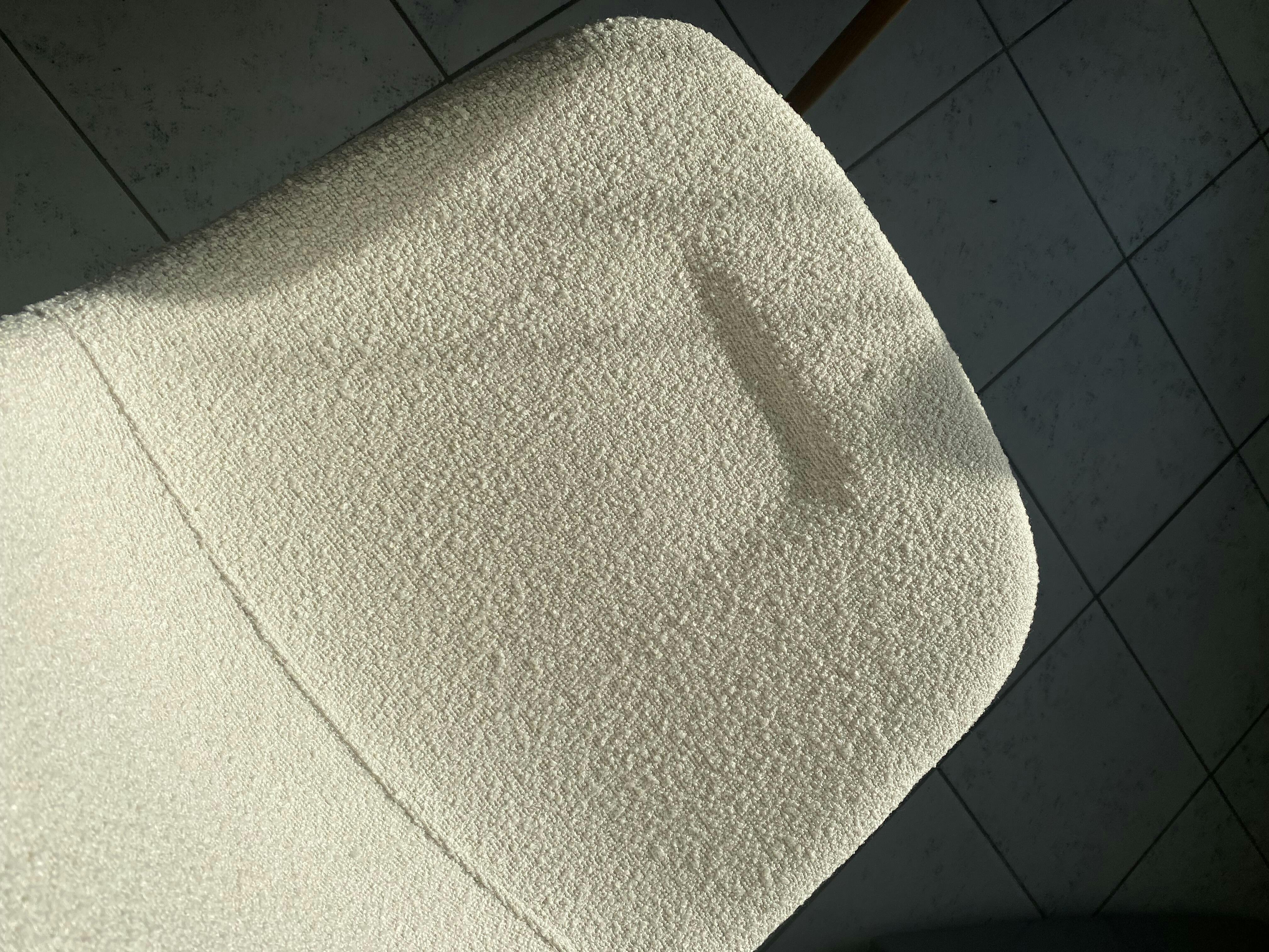 Tuolissa on vakauden ja kestävyyden takaavat savutammen näköiset jalat, ja istuimen valkoinen bouclé-verhoilu tuo pehmeän, kevyen ja ajattoman ilmeen.